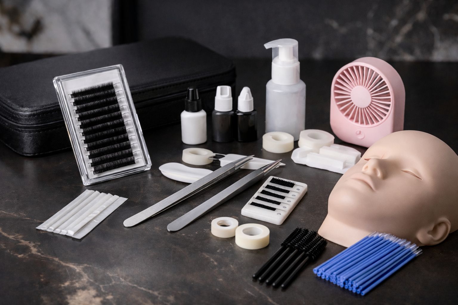 Caja de Pestañas + Adhesivo + Pinzas + Musse + Pads + Cintas + Ventilador + Base para colocar pestañas +Desechables